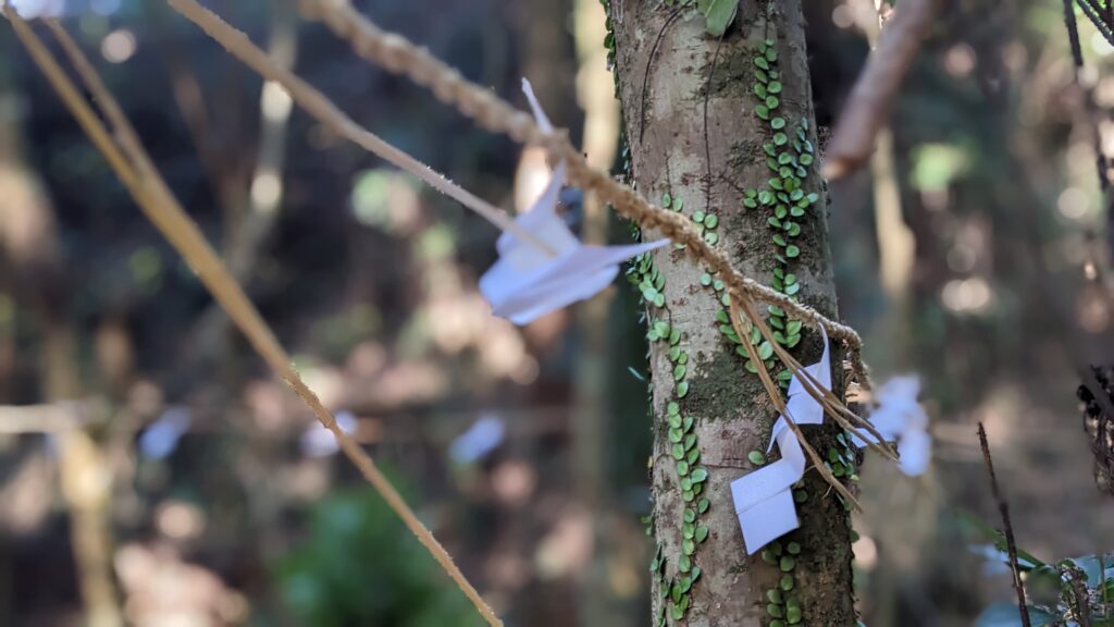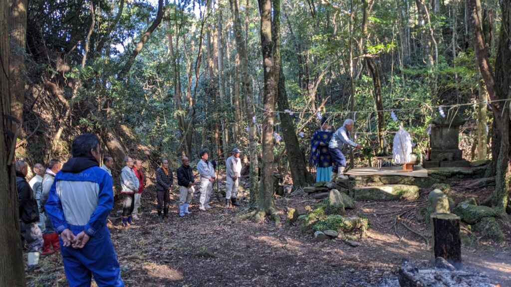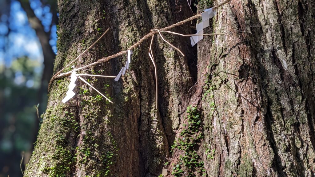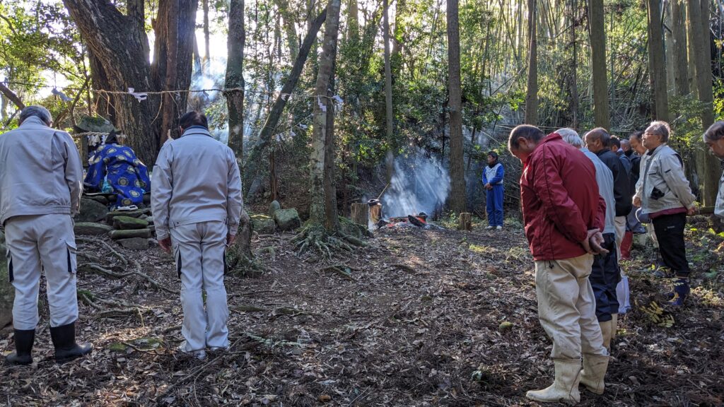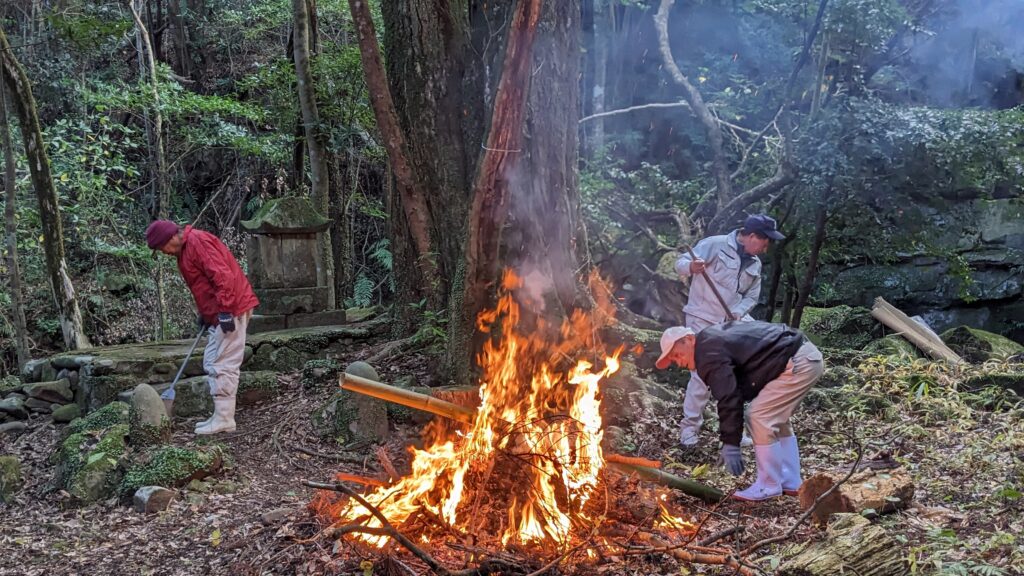予定の開始時間の前から住民の皆さんが原っぱの草刈りを始めていて、以前来た時には鬼の碁盤石の看板も見えないくらいに雑草が生い茂っていたのですが、きれいに刈られて気持ちのいい原っぱになっていました。原っぱの下の窪地では山神様のまわりをきれいにする作業とともに、区長のIさんが山神様とご神木を注連縄で囲み、注連縄に白い紙で作った紙垂(※しで、と読むそうです、初めて知りました)をつける作業を始めていました。Iさんは「縄ん真ん中に指ば入れて広げて、そこにこん紙ば差し込んでください」と私にも手伝わせてくださいました。こんな神聖な行事に新参者の私が加わらせていただけるなんて思いもせず、嬉しかったです。副会長さんが区長のIさんに公園づくりの話をされると、なんと山神様周辺の土地の所有者は区長さんご自身でした(5つ目の偶然)。そして「木や竹を伐るなり、なんでん好きに手ば加えて良かですよ」と言ってくださいました。