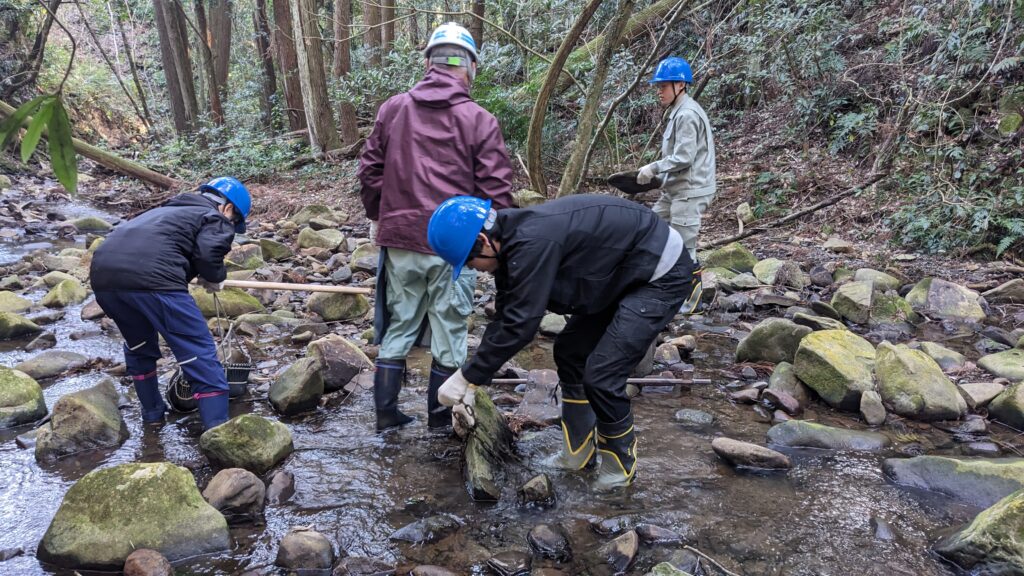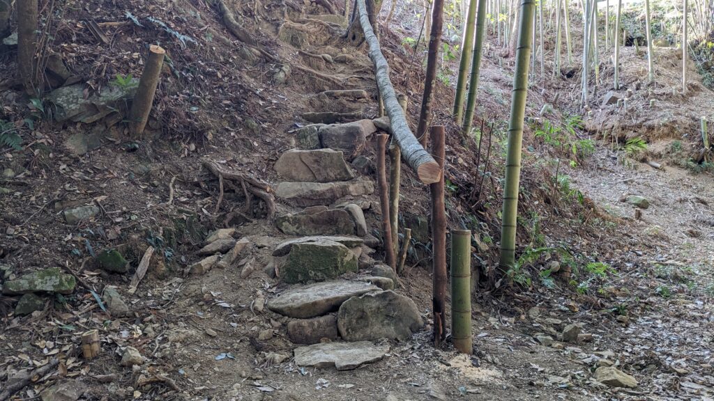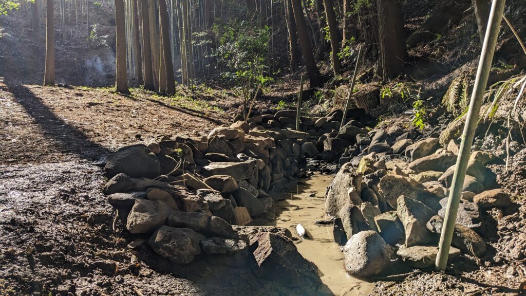 なかでも特に大きな力を発揮してくださったのは、以前、建設業を営んでいた西川和文さん(72)でした。今回の公園づくりでは、ホタルのエサとなるカワニナを増やすためのビオトープ(人工池)づくりと、山神様を祀っている窪地の広場と上の原っぱを安全に昇り降りするための階段づくりという二つのミッションがあったのですが、実はいずれもこれまで造った経験のある人はいませんでした。全員が初心者ということで、どうやって造るか、みんなで知恵を出し合うところから始めました。コンクリートや鉄など人工的なものは使わずに自然にあるもので造るということでまずは合意。その後、現場にたくさんある竹や木を活用して造るという案が出て先行事例などを調べていたのですが、ネックとなったのは維持管理でした。竹は数年で朽ちていくのでそのたびに補修もしくは新たな造り直しが求められます。地域の皆さんの高齢化が進む中で、継続して担っていけるのか、というところで検討はストップ。そんな時、知人から紹介していただいたのが現場から車で15分ほどの隣町でボランティアで公園づくりに取り組んでいる西川さんでした。