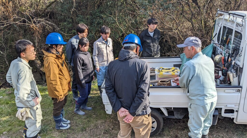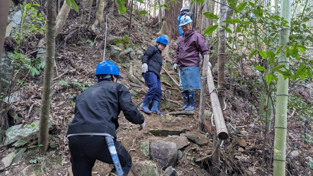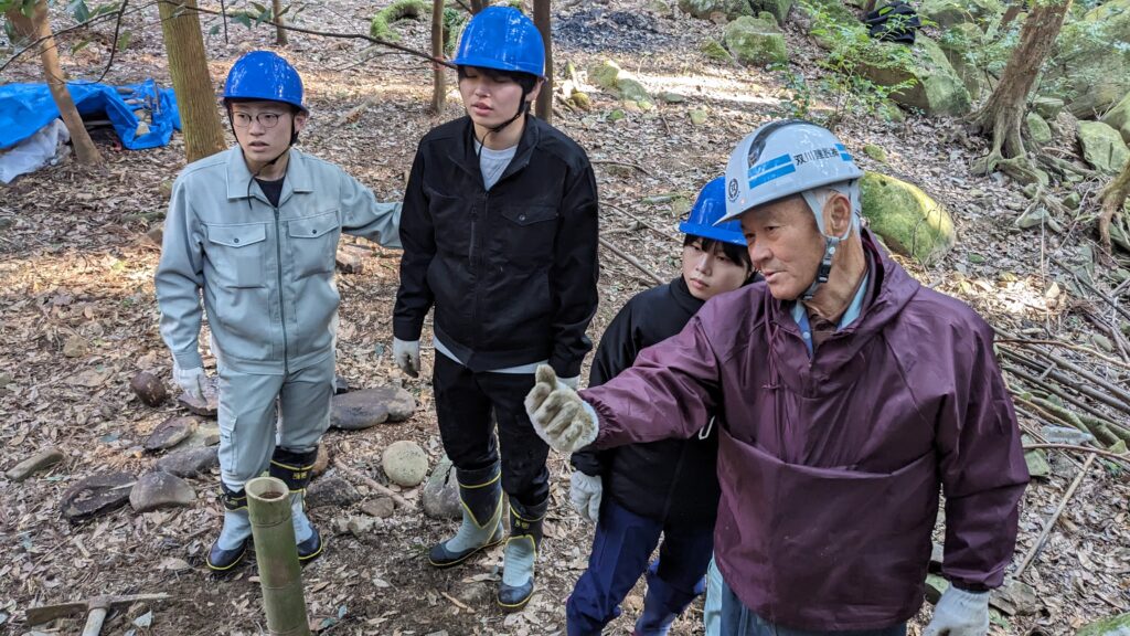今回の公園づくりで、大学生とともに平日から汗を流して下さった地元の方々は主に現役を退かれた60代、70代の方が多かったのですが、皆さん、現役時代に培った技を存分に発揮してくださいました。元製材業者の方は竹や木をチェーンソーで易々と切り倒し、農家の方(今も現役)は杭を打ちこんだり、竹やぶを切り拓いたり、どんな作業も軽々とこなしてくださいました。公園予定地の上の原っぱをショベルカーで整地してくださる方まで‥。一次産業や二次産業が盛んな地方は本当に“人財”が豊富ですね、専門の業者さんにお願いしなくても、いろんなことが実現できてしまいます。